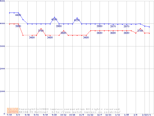 | [↓次グラフ]: | Deskstar 180GXP (7200rpm,8MB,UltraATA/100,FDB)の最安値推移 |