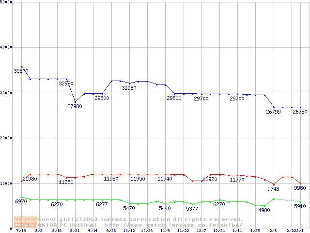 | [↑前グラフ]: | PC800-40 DRDRAM RIMMの最安値推移 |