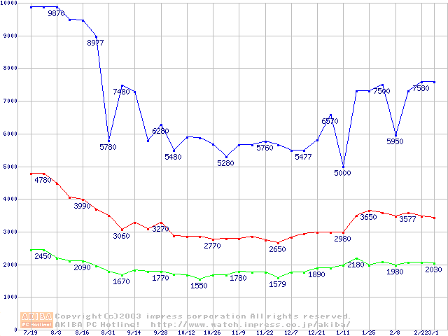 | [↓次グラフ]: | PC100 SDRAM DIMM CasLatency=2 ECC対応の最安値推移 |