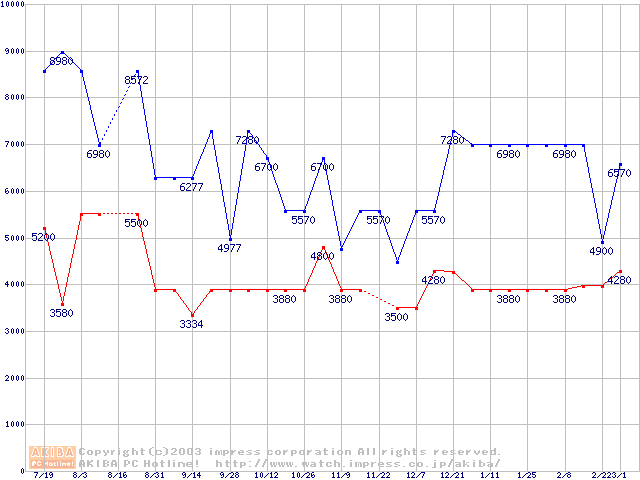 | [↓次グラフ]: | PC100 SDRAM DIMM CasLatency=2 ECC対応 Registeredタイプの最安値推移 |