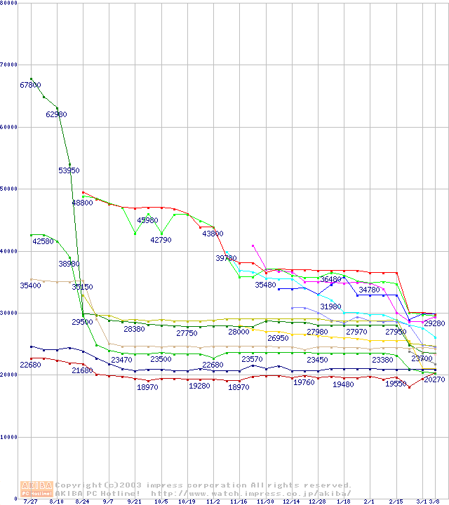 CPU主要製品(最安値3万円以上)の最安値推移