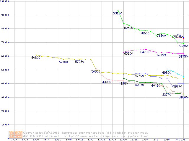 CPU主要製品(最安値2万円~3万円未満)の最安値推移