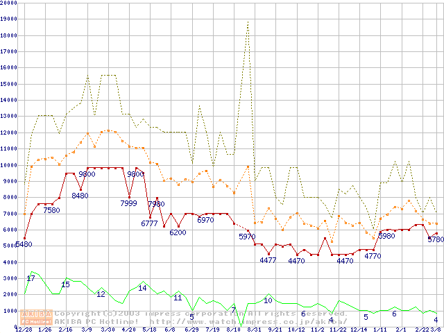 PC133 SDRAM DIMM CasLatency=3 ECC対応の最安値推移