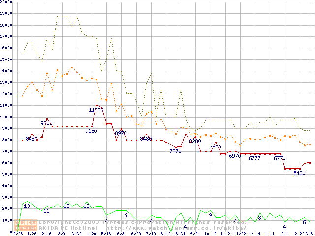 PC133 SDRAM DIMM CasLatency=3 ECC対応 Registeredタイプの最安値推移
