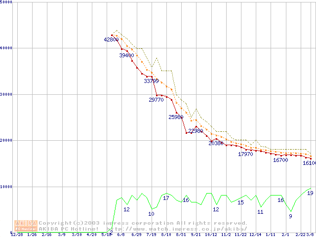Travelstar 40GNX (9.5mm,5400rpm,UltraATA/100,8MB,FDB,20GB/Platter)の最安値推移