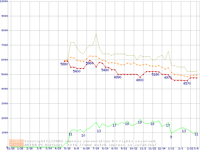 メモリ主要製品(最安値5千円未満)の最安値推移
