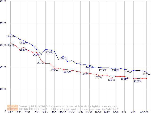 | [↑前グラフ]: | MKシリーズ (9.5mm,5400rpm,16MB,FDB,30GB/Platter)の最安値推移 |