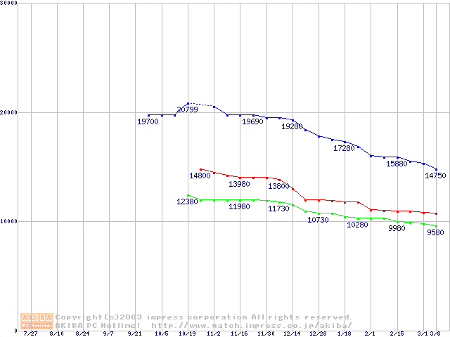 | [↓次グラフ]: | Barracuda ATA IV (7200rpm,UltraATA/100,2MB,40GB/Platter,FDB)の最安値推移 |