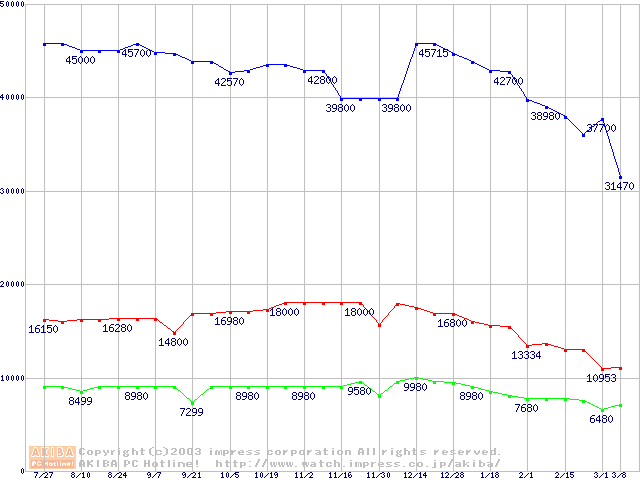 | [↑前グラフ]: | PC2100(DDR266) DDR SDRAM DIMM(CL 2.0)の最安値推移 |