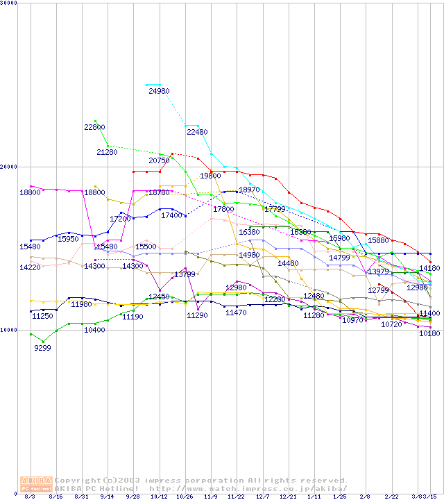 HDD主要製品(最安値1万円~1万5千円未満)の最安値推移