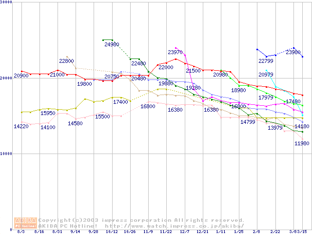 HDD 100~160GB未満(7200rpmクラス)の最安値推移