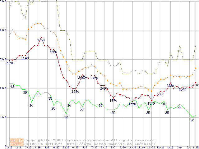 PC100 SDRAM DIMM CasLatency=2の最安値推移