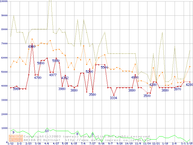 PC100 SDRAM DIMM CasLatency=2 ECC対応の最安値推移