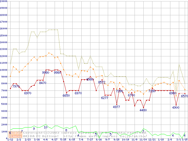 PC100 SDRAM DIMM CasLatency=2 ECC対応の最安値推移