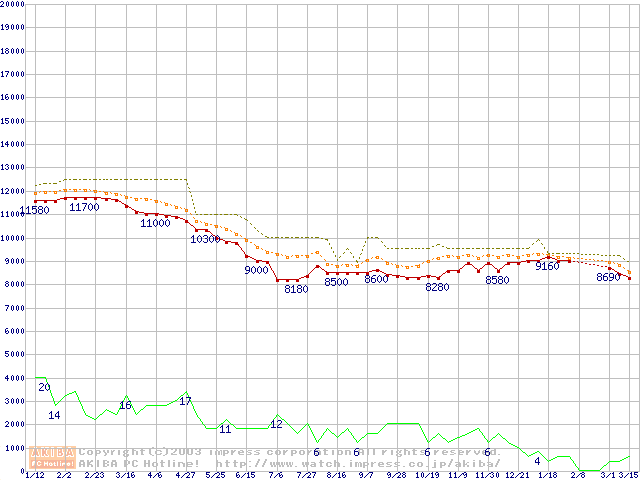 WD Caviar (7200rpm,UltraATA/100,20GB/Platter)の最安値推移