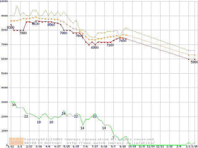 U6 (5400rpm,UltraATA/100 2MB 40GB/Platter)の最安値推移