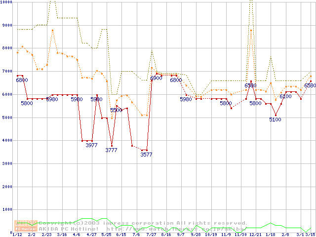 PC133 SDRAM DIMM CasLatency=3 ECC対応 Registeredタイプの最安値推移