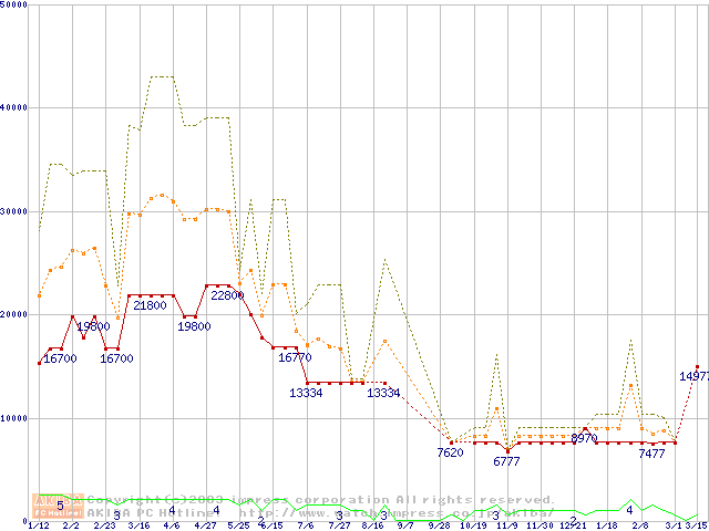 PC100 SDRAM DIMM CasLatency=2 ECC対応 Registeredタイプの最安値推移