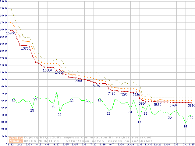 Socket 370 (FC-PGA2,FSB 100MHz,L2 256KB,Tualatin)の最安値推移