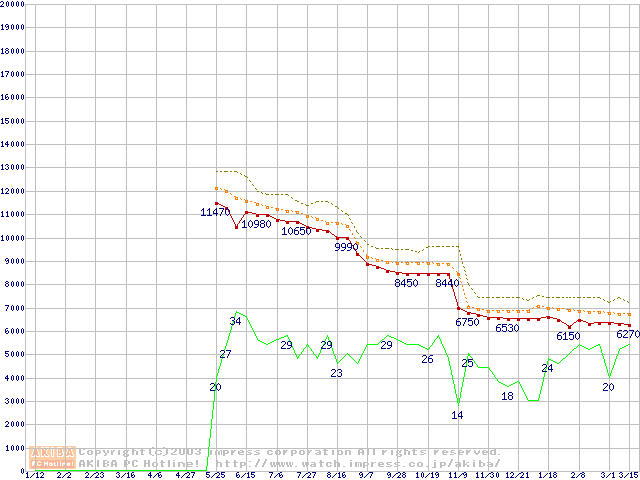 Socket 370 (FC-PGA2,FSB 100MHz,L2 256KB,Tualatin)の最安値推移