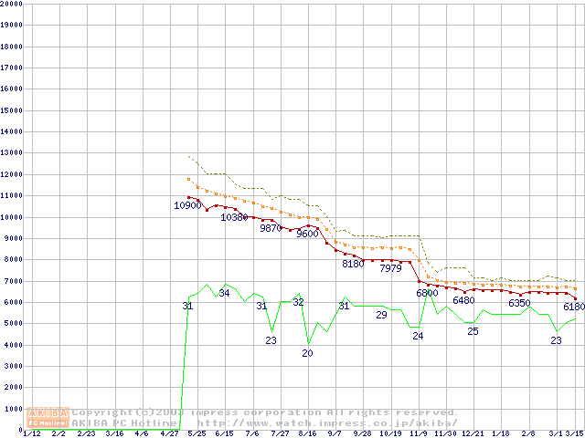 Socket 478 (micro-PGA,FSB 400MHz,L2 128KB,Willamette)の最安値推移