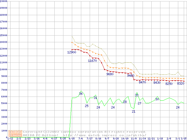 Socket 478 (micro-PGA,FSB 400MHz,L2 128KB,Willamette)の最安値推移