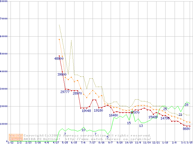 PC3200(DDR400) DDR SDRAM DIMMの最安値推移