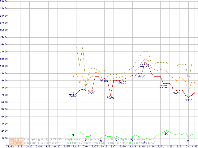 PC2100(DDR266) DDR SDRAM DIMM(CL 2.0) ECC対応 Registeredタイプの最安値推移