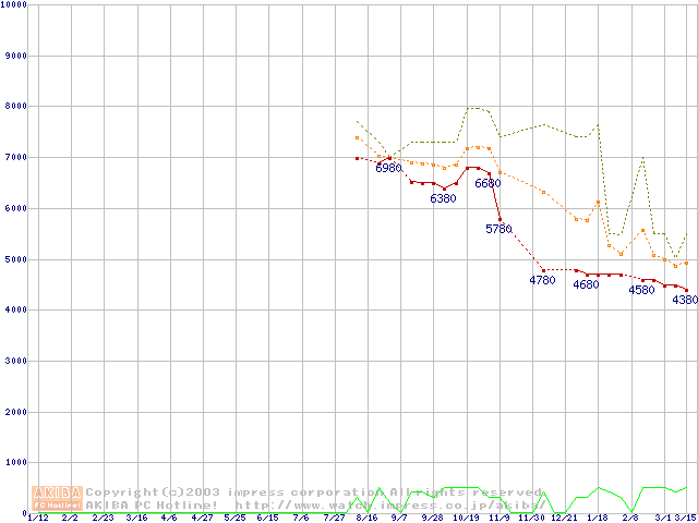 Socket 370 (FC-PGA,FSB 100MHz,L2 128KB,Coppermine)の最安値推移