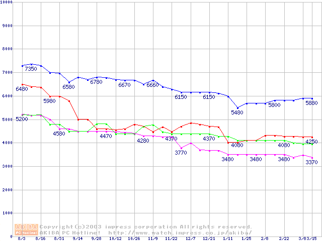 | [↓次グラフ]: | Socket A (PGA,FSB 200MHz,L2 64KB,Spitfire)の最安値推移 |