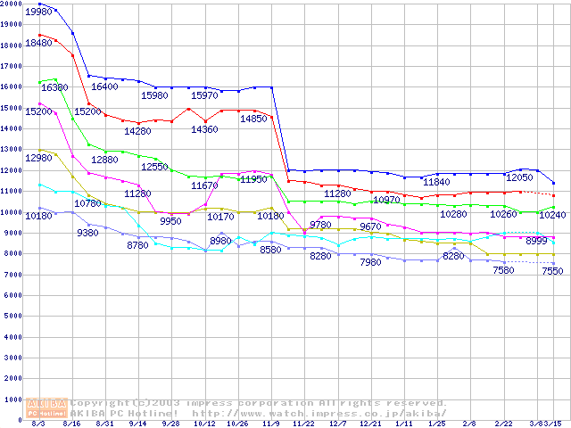| [↑前グラフ]: | Socket A (OPGA,FSB 266MHz,L2 256KB,Thoroughbred)の最安値推移 |