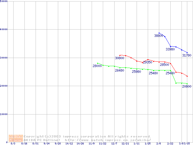 | Socket A (OPGA,FSB 266MHz,L2 256KB,Thoroughbred)の最安値推移 |
