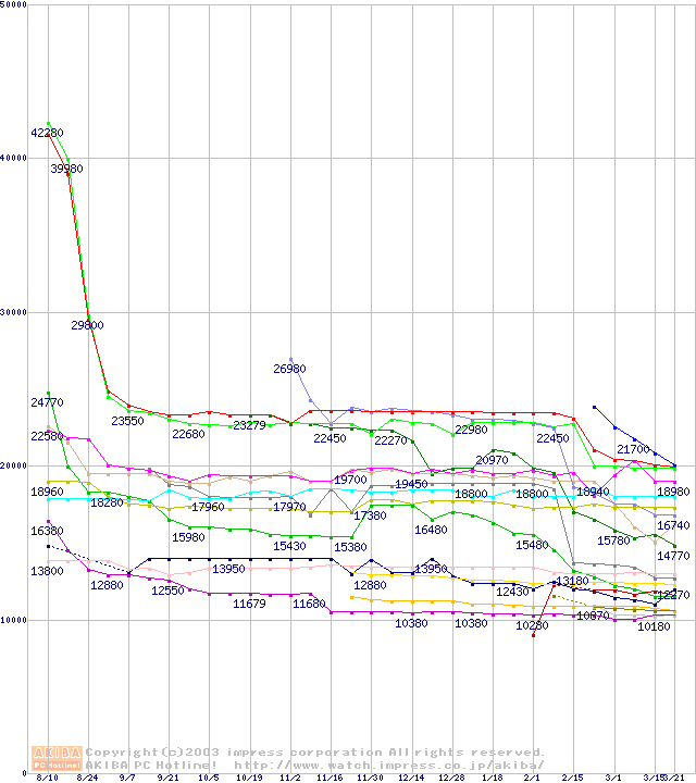 CPU主要製品(最安値1万円~2万円未満)の最安値推移