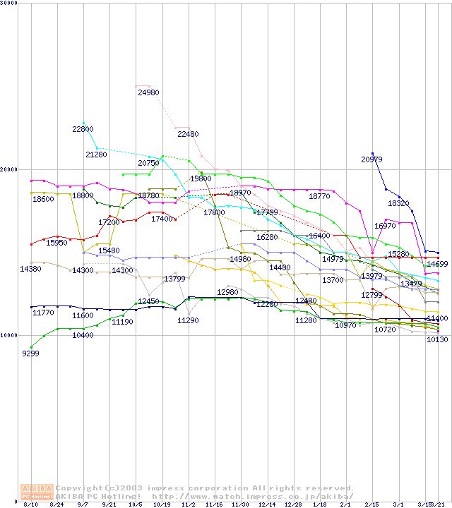 HDD主要製品(最安値1万5千円~2万円未満)の最安値推移