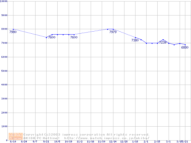 | [↑前グラフ]: | HDD 20GB~30GB未満(5400rpmクラス)の最安値推移 |