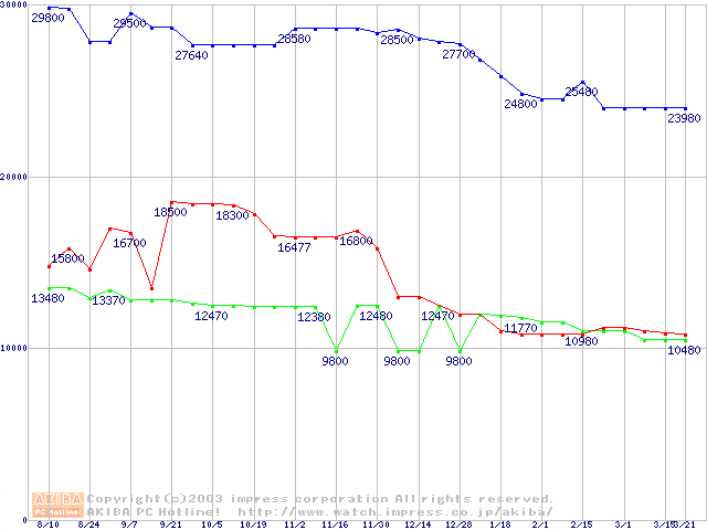 メモリ主要製品(最安値1万円以上)の最安値推移