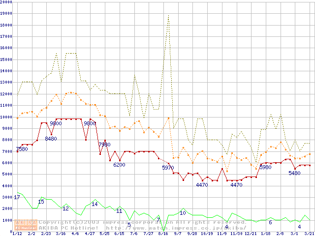 PC133 SDRAM DIMM CasLatency=3 ECC対応の最安値推移