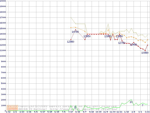 Socket 370 (FC-PGA,FSB 133MHz,L2 256KB,Coppermine)の最安値推移