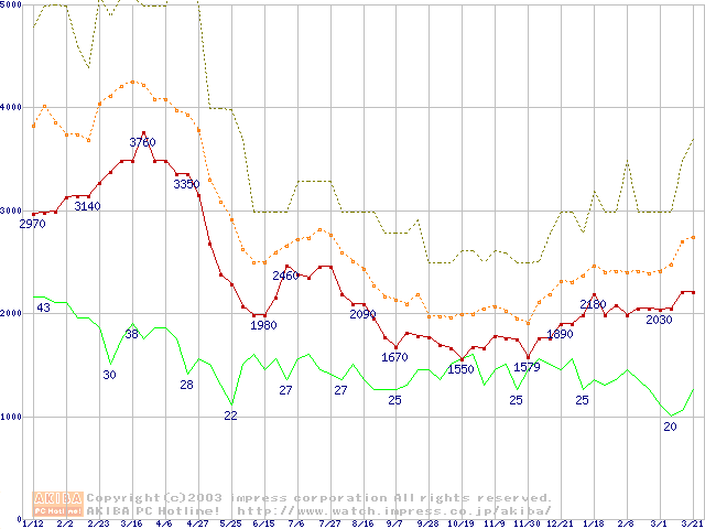 PC100 SDRAM DIMM CasLatency=2の最安値推移