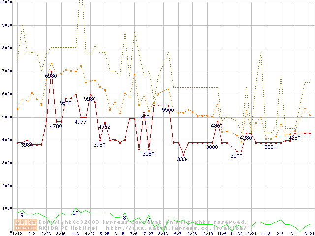 PC100 SDRAM DIMM CasLatency=2 ECC対応の最安値推移