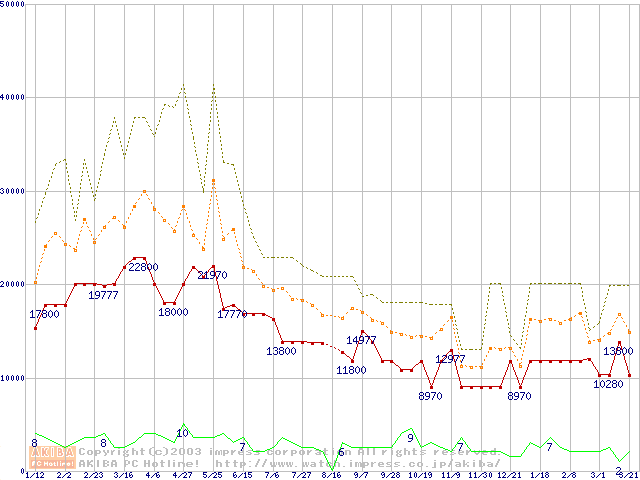 PC133 SDRAM DIMM CasLatency=3 ECC対応 Registeredタイプの最安値推移