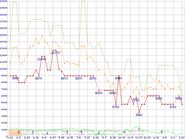 PC100 SDRAM DIMM CasLatency=2 ECC対応 Registeredタイプの最安値推移