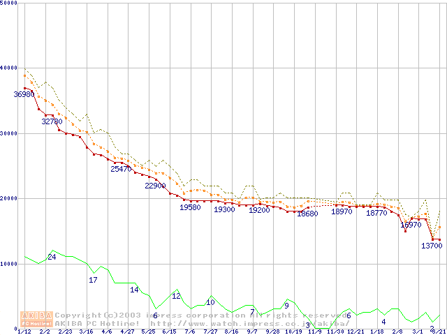 WD Caviar (7200rpm,UltraATA/100,2MB)の最安値推移