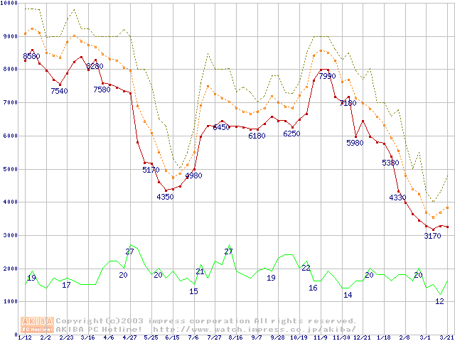 メモリ主要製品(最安値5千円未満)の最安値推移