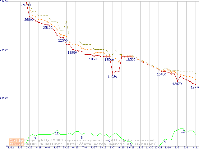 WD Caviar (5400rpm,UltraATA/100,2MB)の最安値推移