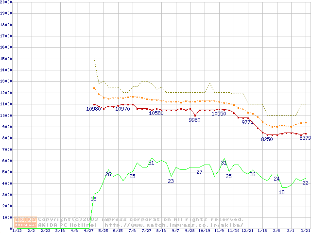 メモリ主要製品(最安値5千円~1万円未満)の最安値推移