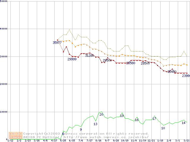メモリ主要製品(最安値1万円以上)の最安値推移