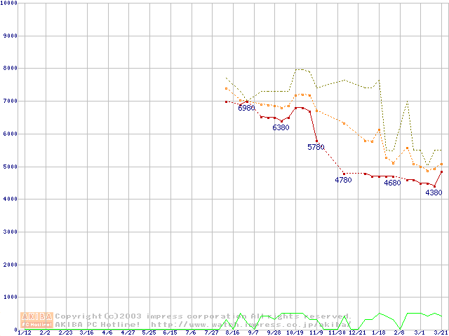 Socket 370 (FC-PGA,FSB 100MHz,L2 128KB,Coppermine)の最安値推移