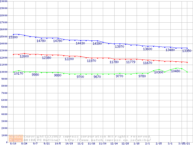 | [↑前グラフ]: | Travelstar 40GNX (9.5mm,5400rpm,UltraATA/100,8MB,FDB,20GB/Platter)の最安値推移 |