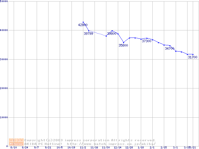 | [↑前グラフ]: | Travelstar 40GN (9.5mm,4200rpm,UltraATA/100,2MB,FDB,20GB/Platter)の最安値推移 |